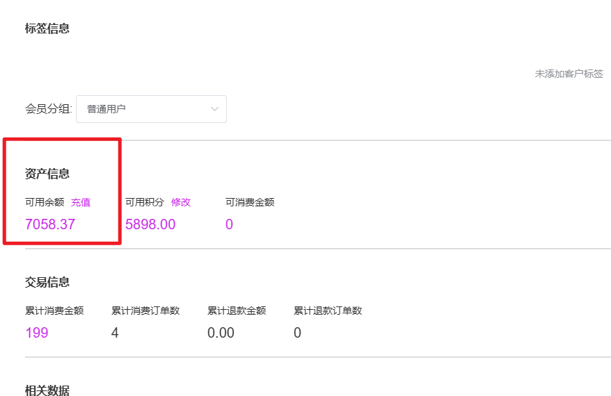进入会员详情页后,找到「资产信息」区域,这里可以看到该会员当前的可用余额、可用积分和可消费金额。在「可用余额」后面点击「充值」,系统会弹出充值窗口。