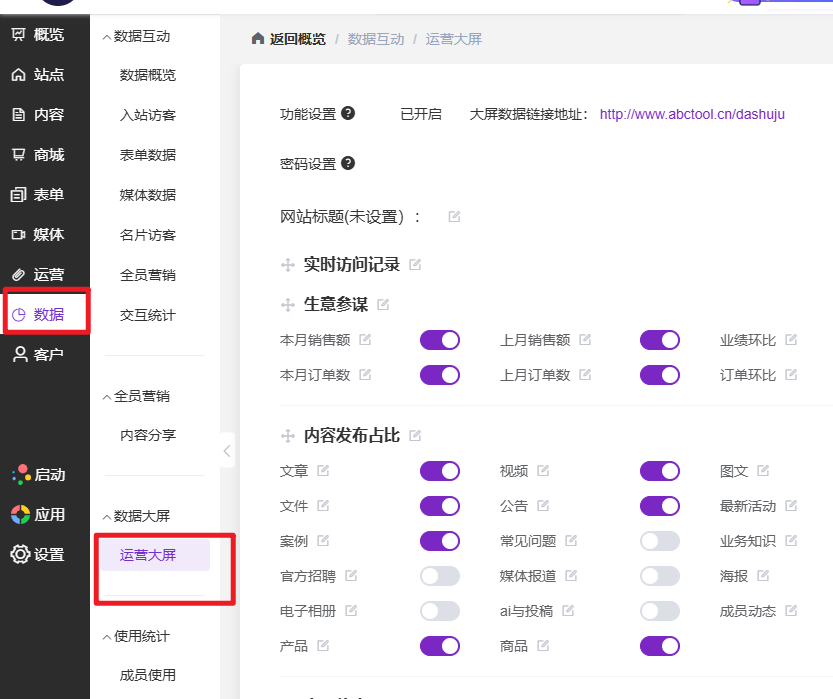 进入「运营大屏」页面后,先确认数据大屏功能已经开启。