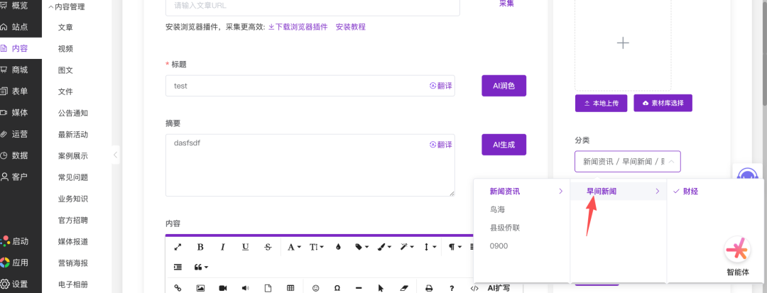 操作路径:营销枢纽后台—内容管理—新增/编辑内容