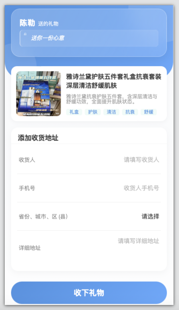 如果这份礼物在送出时,赠送人已经提前把收货地址填写好了,收礼人打开页面后就不需要再补地址。页面会直接展示已经填写好的收货信息,这种情况下只要点击「收下礼物」,就可以直接完成确认。