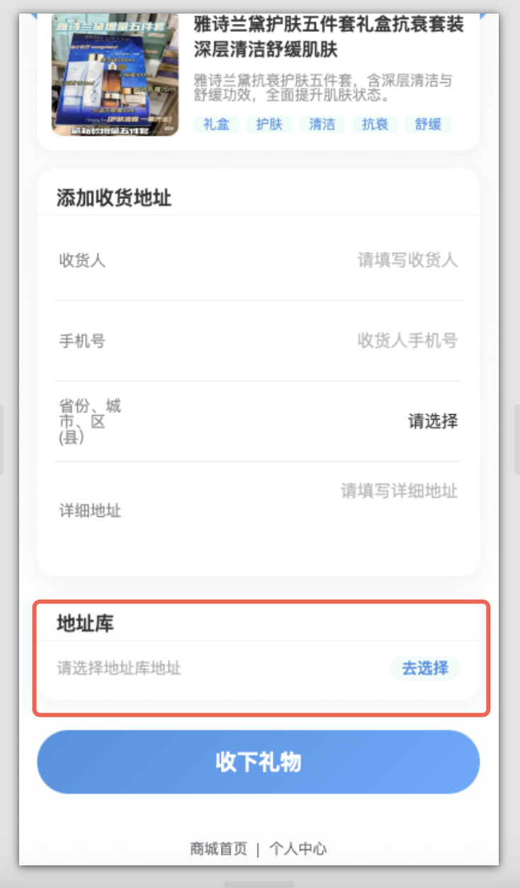 如果收礼人已经登录商城账号,在「收礼物」页面里除了可以手动填写地址,还可以直接使用地址库。页面会显示「地址库」和「去选择」入口,点击后就能从会员地址库里选择之前已经保存过的地址,选中后直接用于本次收礼。