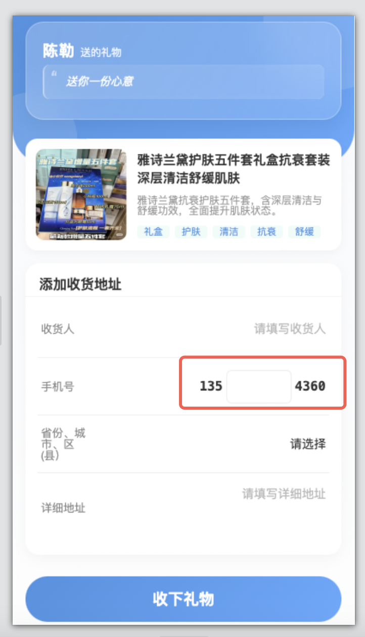 如果赠送人在送礼时设置了需要验证收货人手机号,收礼人不需要再完整输入整串手机号。现在页面会直接显示手机号的前 3 位和后 4 位,收礼人只需要补全中间 4 位,就可以完成手机号验证,这样更方便确认当前礼物对应的是哪一个收货手机号。