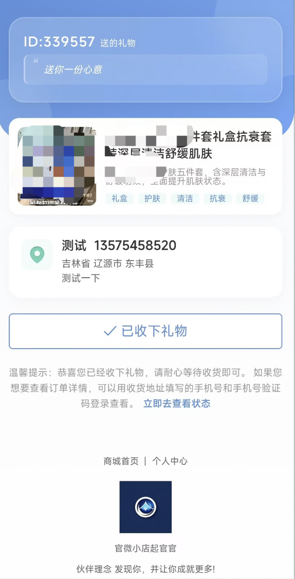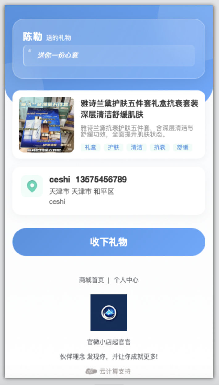 操作路径:移动端商城—打开送礼链接—进入「收礼物」页面