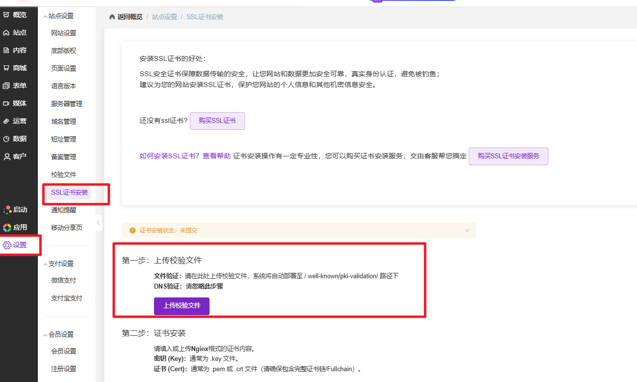 如果你是在安装 SSL 证书过程中,需要做文件校验,这类文件不在上面的入口上传,而是需要使用专门的 SSL 校验入口。