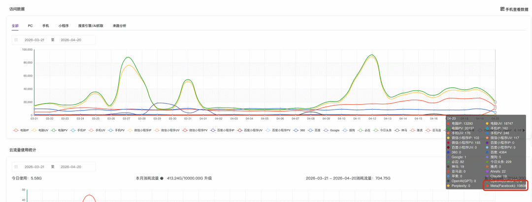 如果你最近在后台看到网站有一批异常访问,想确认这些访问是不是来自 Meta(Facebook) 的爬虫,现在可以直接在后台单独查看这类数据了。系统已经对 Meta(Facebook) 爬虫做了专门识别,方便你把这类抓取访问和正常用户访问区分开。