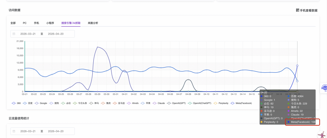 进入首页数据曲线中的「搜索引擎/AI抓取数据」后,图表图例里也已经增加了「Meta(Facebook)」类型。你可以直接查看这类爬虫在不同时间段的抓取趋势,用来判断近期是否出现了较多来自 Meta(Facebook) 的采集访问。