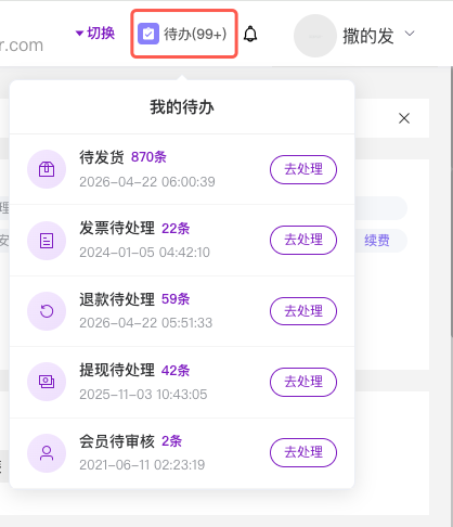如果需要处理某一类事项,可以点击该事项右侧的「去处理」。系统会自动跳转到对应的后台页面,你可以继续完成发货、开票、退款审核、提现处理或会员审核等操作。