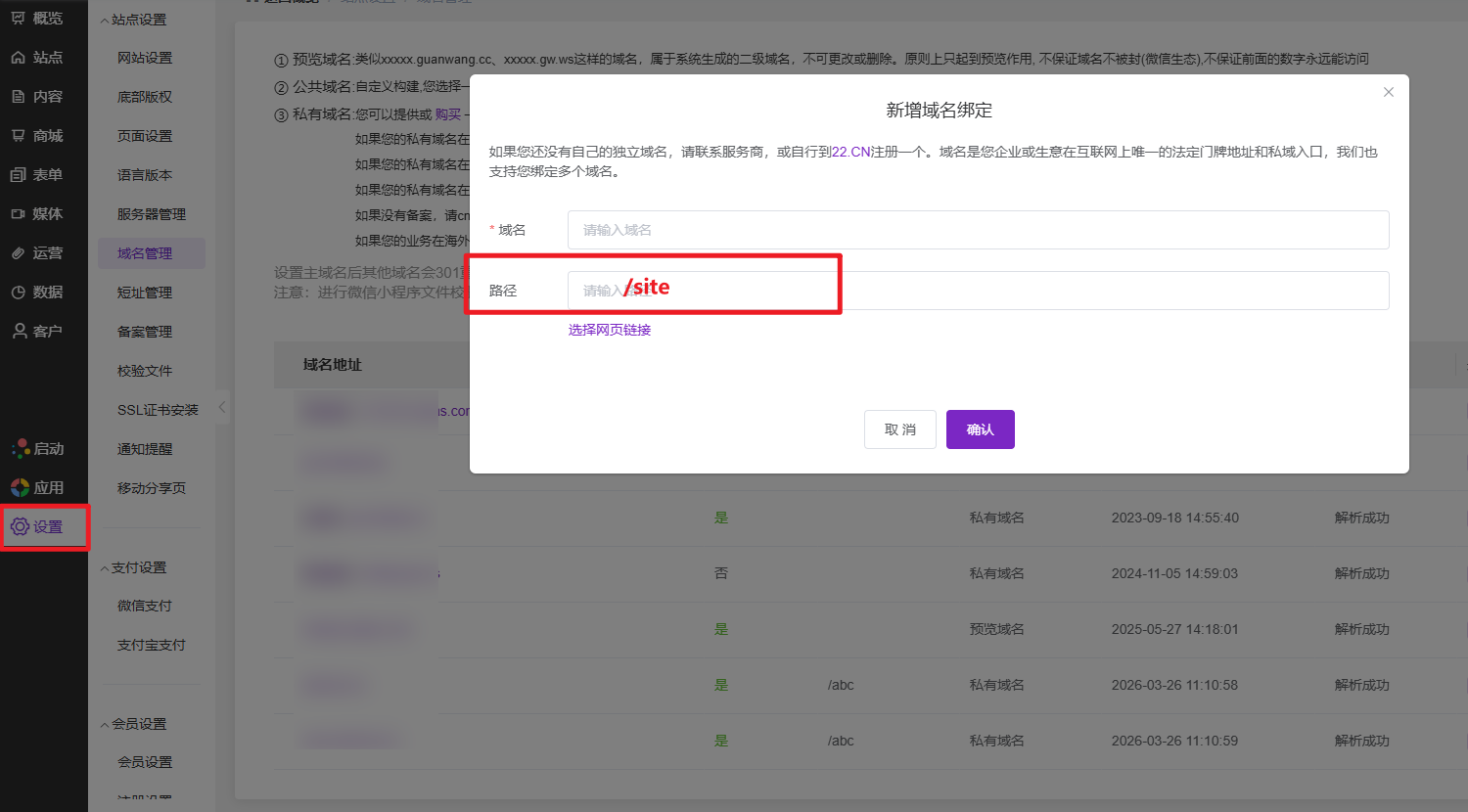 操作路径:后台—设置—站点设置—域名管理