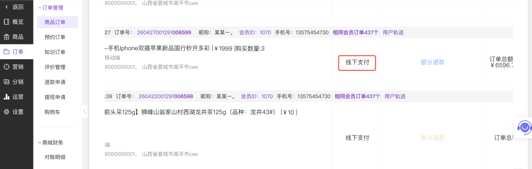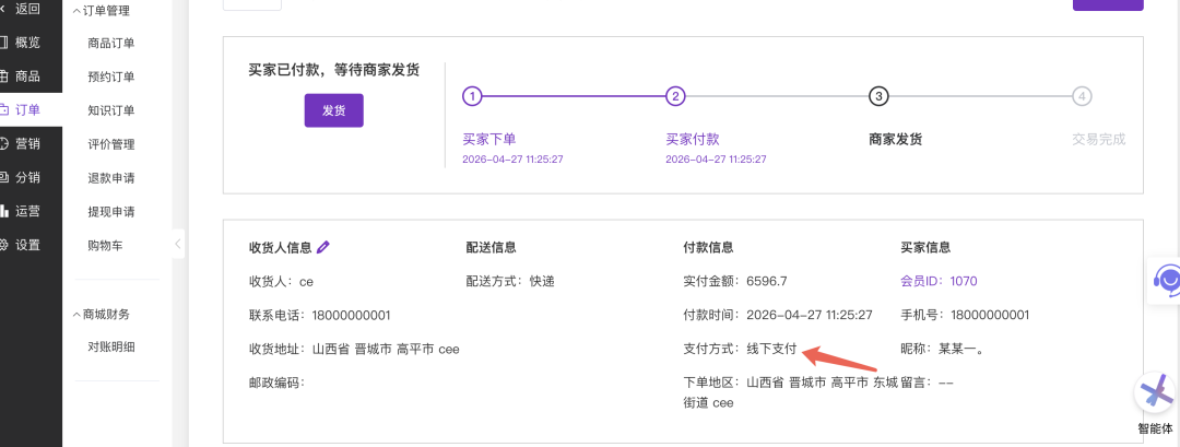 进入「商品订单」页面后,在订单列表中可以看到对应订单的支付方式会显示为自定义名称,例如「线下支付」。进入订单详情页后,在「付款信息」区域也会同步显示这个支付方式名称,方便后台核对订单的实际付款方式。