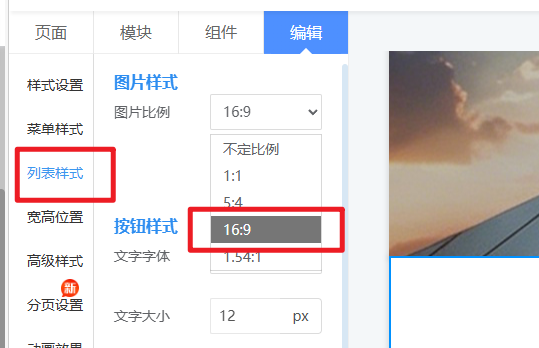 在「列表样式」中找到「图片比例」选项。这里可以选择不定比例、1:1、5:4、16:9、1.54:1 等比例,你可以根据当前列表图片的实际尺寸选择更合适的比例。