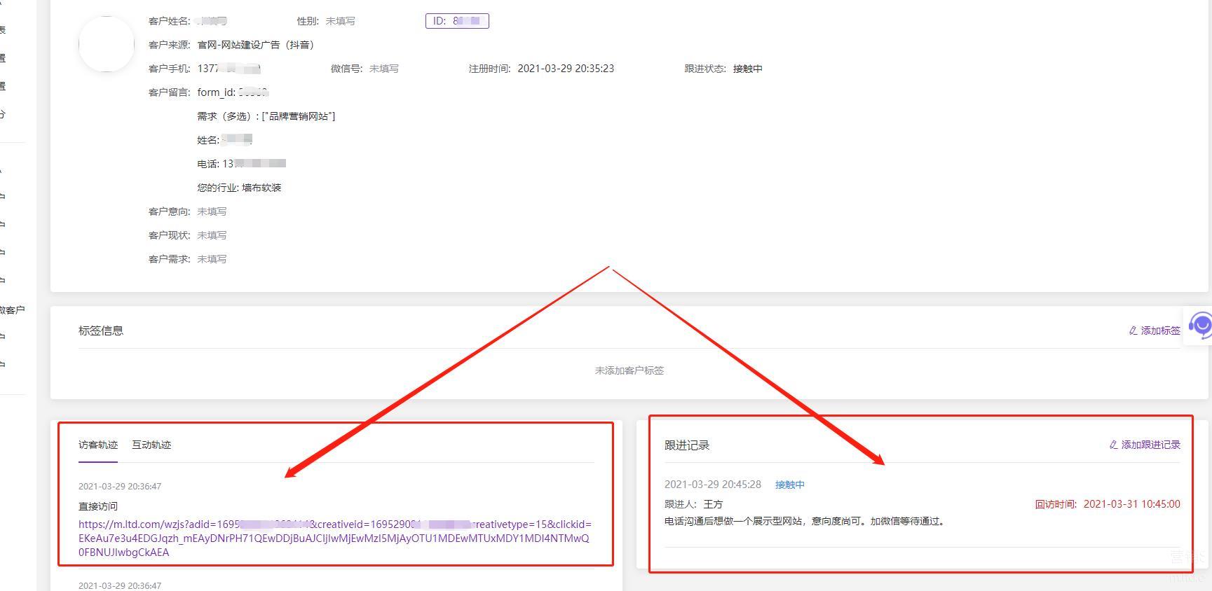这其中包括客户留下的具体信息,以及跟进过程中的交流记录和用户的访客轨迹、互动轨迹,提高线索跟进的有效性。