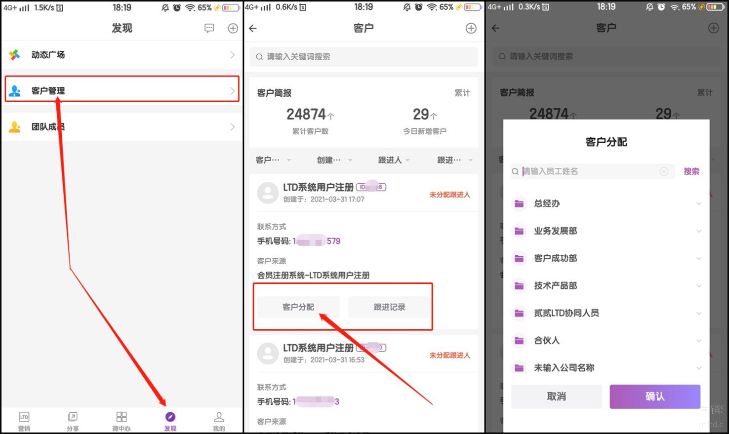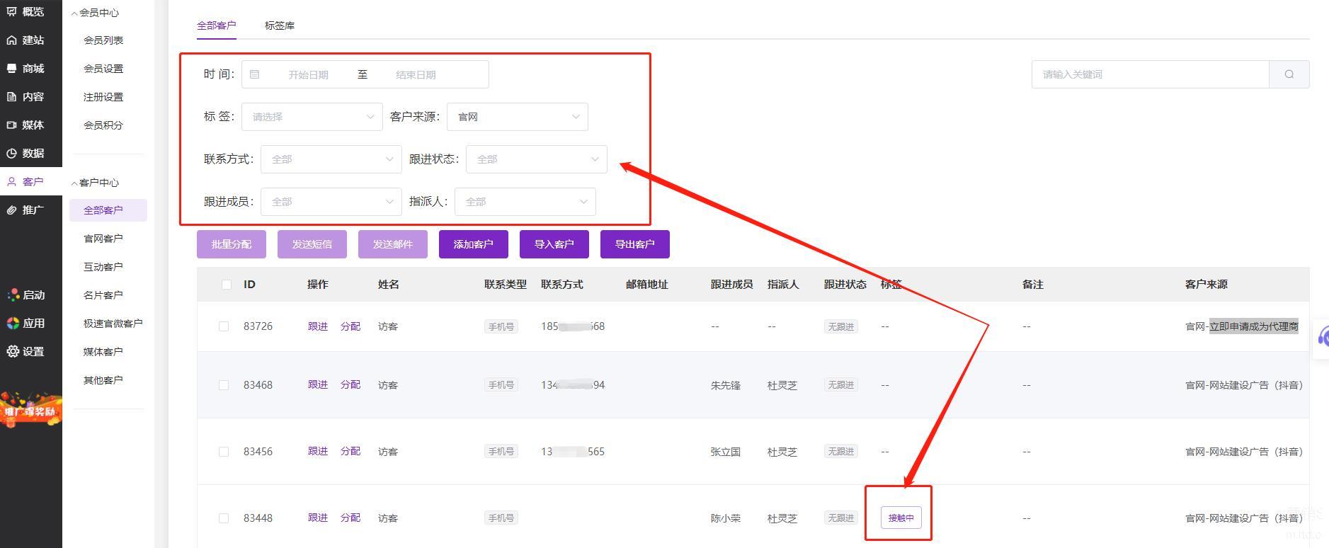 LTD营销中台帮你轻松管理客户线索,一键分配跟进人员、实时查看跟进进度、批量发送短信邮件,让每一条客户线索都能发挥最大化的效果!