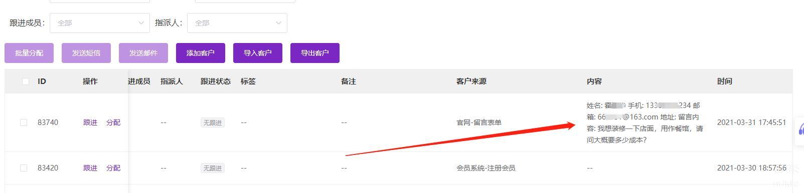 接着负责线索管理的人员就会收到信息通知,他可以直接在客户线索栏看到这一则线索。