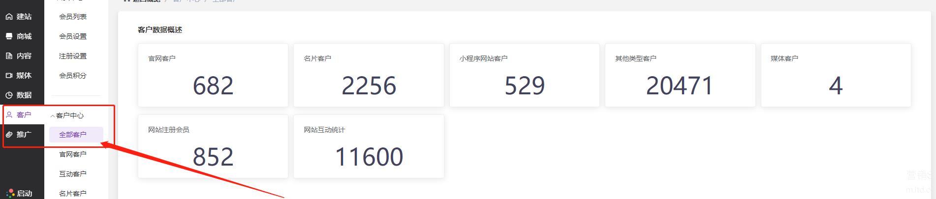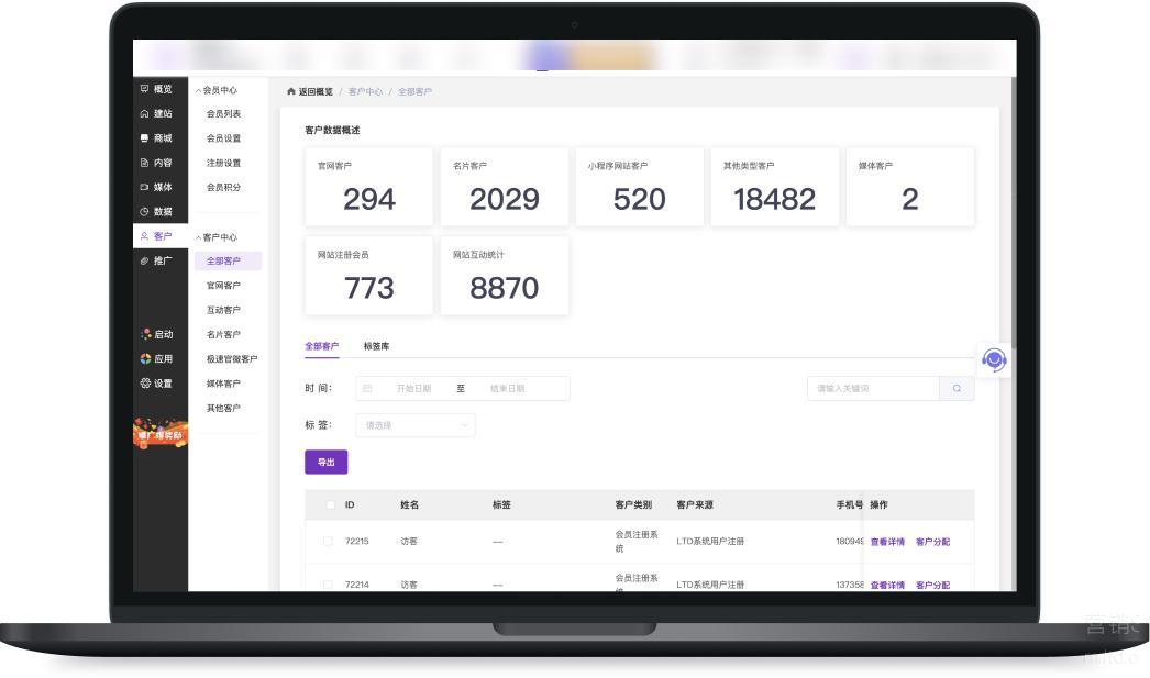 点开LTD营销中台,在右侧导航栏选择“客户-客户中心”,就可以看到包括官网客户、官微名片客户、小程序网站客户、媒体客户、网站注册会员等客户信息,全渠道客户线索统一回收。