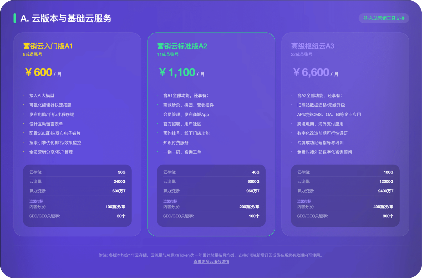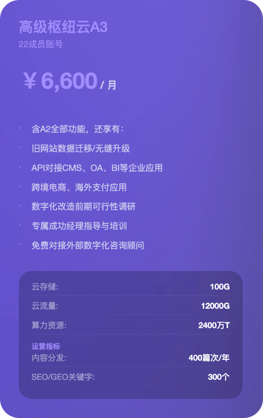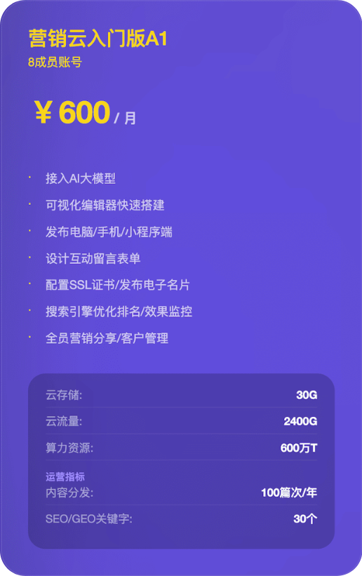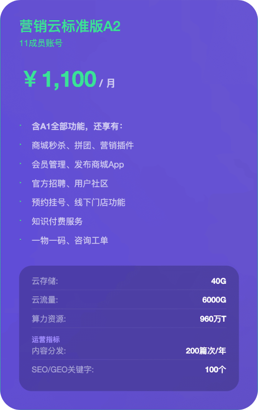 官方标准售价13200元/年,11成员,在营销云入门版的基础之上,还额外提供在线客服商城风格设置、批量管理图文视频知识付费服务官方直播链接企业微信、打包导出静态网站等功能,此外,A2版相比A1版在内容分发数量上也提升至200篇次/年监控SEO关键词数量由30个上升至100个