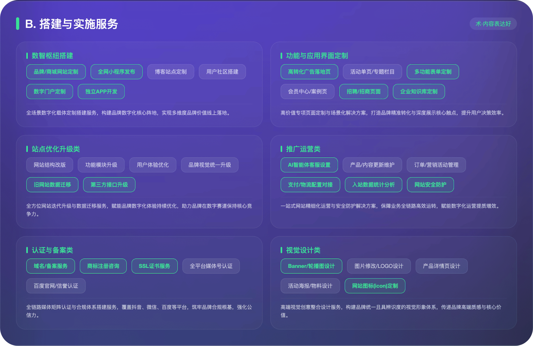 服务内容包含:网站SEO优化原创软文撰写短视频剪辑正版图库授权品牌运营推广问答内容分发代备案服务、百家号知乎机构号新浪微博微信公众号等账号认证等。