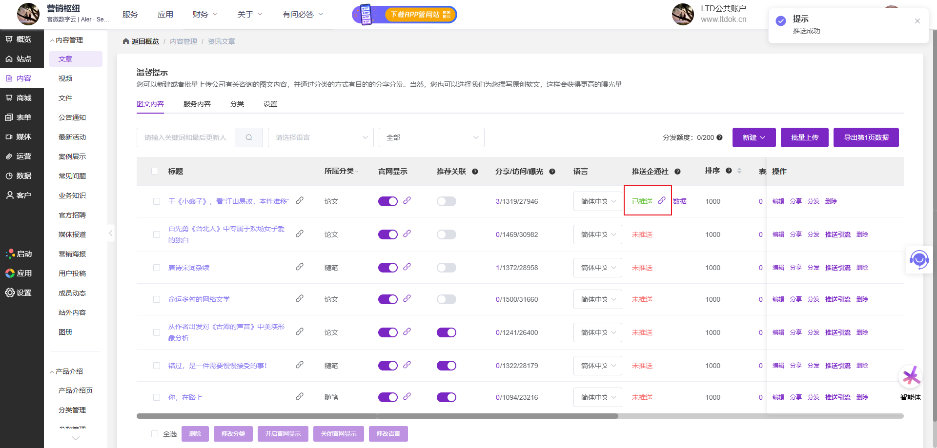 营销场景2:参与冬耕服务月的企业主,内容上传后,随手点击“推送至企通社”,为冷启动的内容加热。