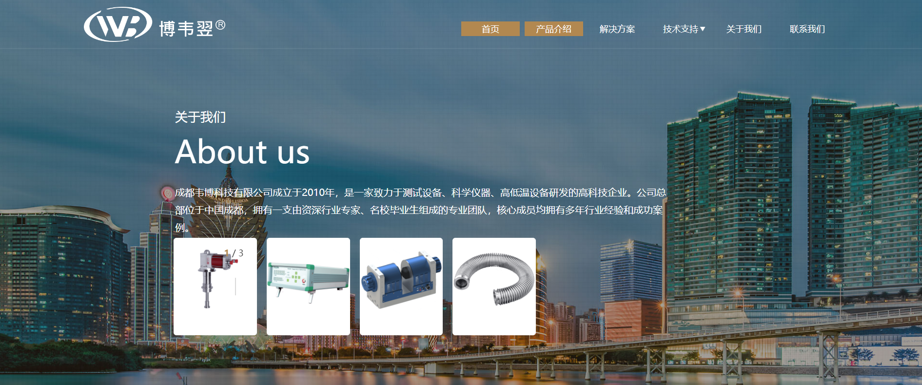 成都韦博科技有限公司成立于2010年,是一家致力于测试设备、科学仪器、高低温设备研发的高科技企业。公司总部位于中国成都,拥有一支由资深行业专家、名校毕业生组成的专业团队,核心成员均拥有多年行业经验和成功案例