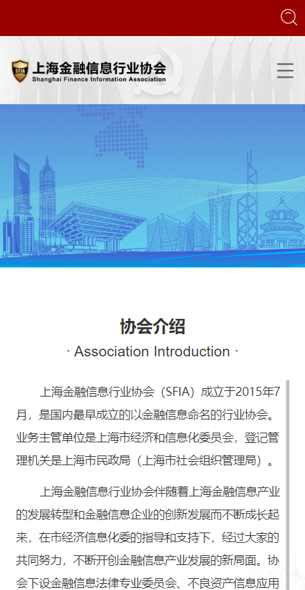 上海金融信息行业协会(SFIA)成立于2015年7月,是国内最早成立的以金融信息命名的行业协会。业务主管单位是上海市经济和信息化委员会,登记管理机关是上海市民政局(上海市社会组织管理局)。
