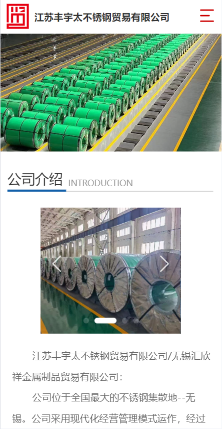 江苏丰宇太不锈钢贸易有限公司位于全国最大的不锈钢集散地--无锡。公司采用现代化经营管理模式运作,经过不断的发展与整合,逐步成为集贸易、加工、仓储、运输四位一体的工贸公司。