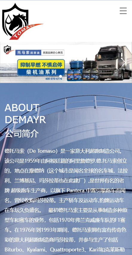 德托马索(De Tomaso)是一家意大利超跑制造公司。该公司是1959年由阿根廷籍的阿里詹德罗.德.托马索创立的,地点在摩德纳(这个城市是闻名全球的名车城,法拉利、兰博基尼、玛莎拉蒂也在此建厂),是世界有名的老牌 超级跑车生产商,以旗下 Pantera 中置引擎跑车而闻名,曾经收购玛莎拉蒂。