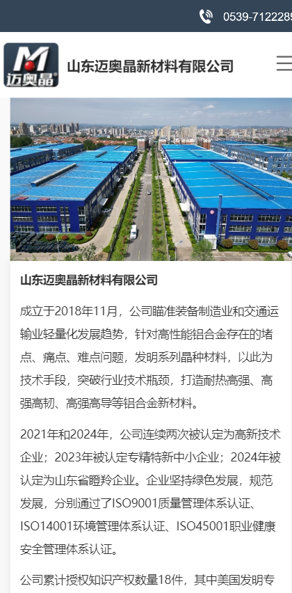 成立于2018年11月,公司瞄准装备制造业和交通运输业轻量化发展趋势,针对高性能铝合金存在的堵点、痛点、难点问题,发明系列晶种材料,以此为技术手段,突破行业技术瓶颈,打造耐热高强、高强高韧、高强高导等铝合金新材料。