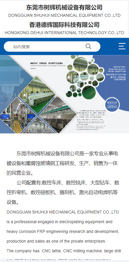 东莞市树辉机械设备有限公司是一家专业从事电镀设备和重腐蚀玻璃钢工程研发、生产、销售为一体的民营企业。公司配置有:数控车床、数控铣床、大型钻车、数控折弯机、数控碰板机、雕刻机、激光自动电焊机等设备。