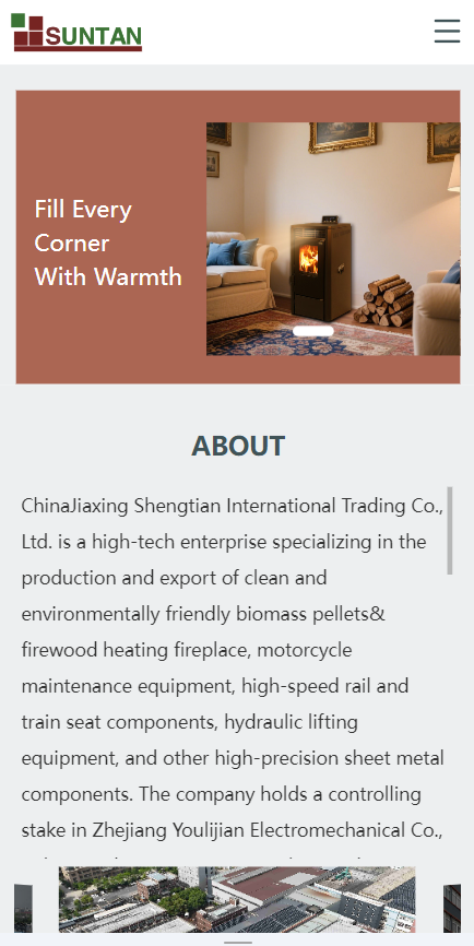 ChinaJiaxing Shengtian International Trading Co., Ltd. is a high-tech enterprise specializing in the production and export of clean and environmentally friendly biomass pellets& firewood heating fireplace, motorcycle maintenance equipment, high-speed rail and train seat components, hydraulic lifting equipment, and other high-precision sheet metal components.