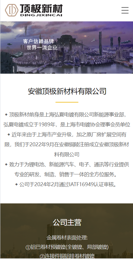 顶极新材前身是上海弘夏电镀有限公司新能源事业部,弘夏电镀成立于1989年,是上海市电镀协会理事会员单位 ◆ 近年来由于上海市产业升级,加之原厂房扩展空间有限,我们于2022年9月在安徽铜陵注册成立安徽顶极新材料有限公司 ◆ 致力于为锂电池、新能源汽车、电子、通讯等行业提供专业的研发、制造、销售于一体的全方位服务。