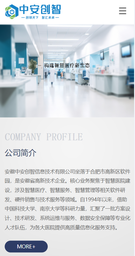 安徽中安创智信息技术有限公司坐落于合肥市高新区软件园,是安徽省高新技术企业。核心业务聚焦于智慧医院建设,涉及智慧医疗、智慧服务、智慧管理等相关软件研发、硬件销售与技术服务等领域。