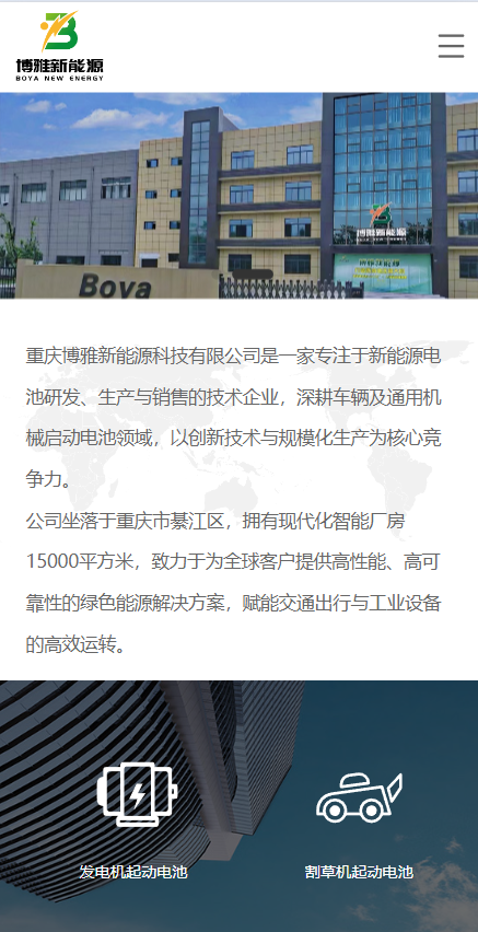 重庆博雅新能源科技有限公司是一家专注于新能源电池研发、生产与销售的技术企业,深耕车辆及通用机械启动电池领域,以创新技术与规模化生产为核心竞争力。 公司坐落于重庆市綦江区,拥有现代化智能厂房15000平方米,致力于为全球客户提供高性能、高可靠性的绿色能源解决方案,赋能交通出行与工业设备的高效运转。