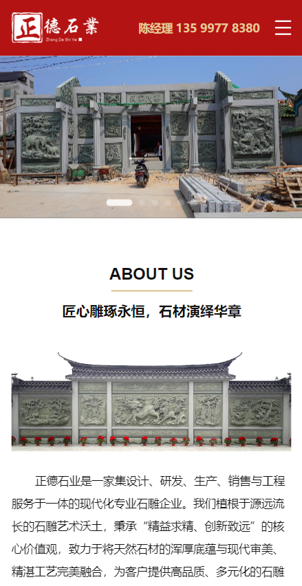 正德石业是一家集设计、研发、生产、销售与工程服务于一体的现代化专业石雕企业。我们植根于源远流长的石雕艺术沃土,秉承“精益求精、创新致远”的核心价值观,致力于将天然石材的浑厚底蕴与现代审美、精湛工艺完美融合,为客户提供高品质、多元化的石雕艺术产品与解决方案。