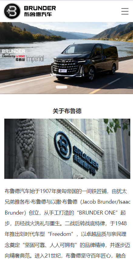 布鲁德汽车始于1907年奥匈帝国的一间铁匠铺,由犹太兄弟雅各布·布鲁德与以撒·布鲁德(Jacob Brunder/Isaac Brunder)创立,从手工打造的“BRUNDER ONE”起步,历经战火洗礼与重生。二战后转战底特律,于1948年推出划时代车型“Freedom”,以卓越品质与亲民理念奠定“坚固可靠、人人可拥有”的品牌精神,并逐步迈向精奢典范。