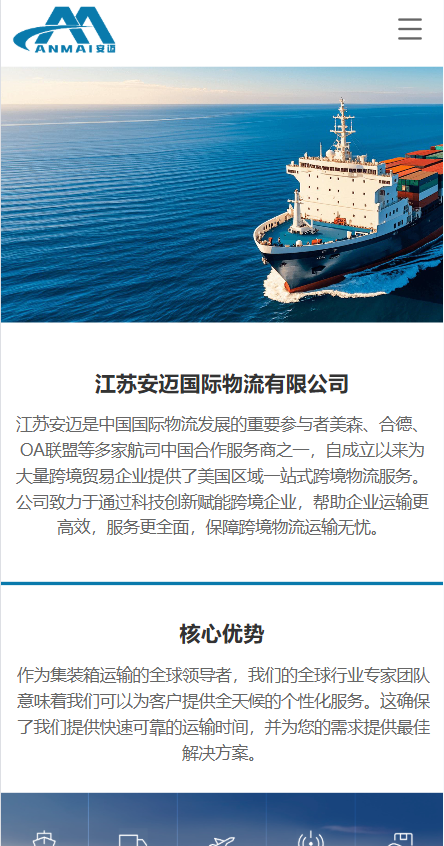 江苏安迈是中国国际物流发展的重要参与者美森、合德、OA联盟等多家航司中国合作服务商之一,自成立以来为大量跨境贸易企业提供了美国区域一站式跨境物流服务。 公司致力于通过科技创新赋能跨境企业,帮助企业运输更高效,服务更全面,保障跨境物流运输无忧。