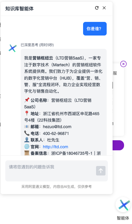 用户点击网站右下角的智能体入口,进入对话窗口,输入问题即可获取基于网站内容的AI专业解答。