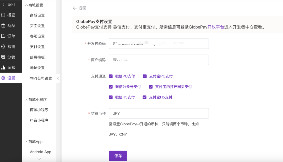 登录官微中心,进入商城模块,依次点击“设置”-“支付设置”-“GlobePay支付”,根据需求设置开发校验码、商户编码、支付通道(微信PC支付、支付宝PC支付、微信公众号支付、支付宝内打开网页支付、微信H5支付、支付宝H5支付等)及结算币种(如JPY、CNY),点击保存完成配置。