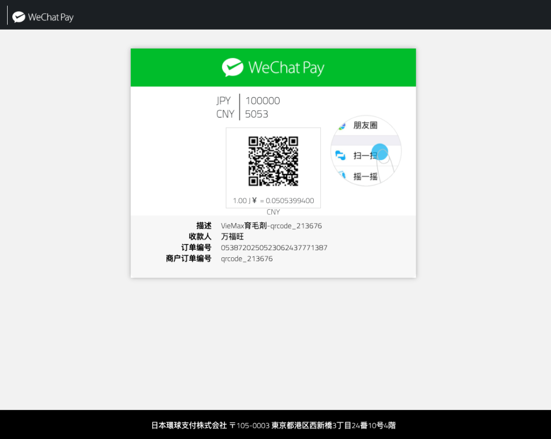买家在PC端订单页面选择微信支付,使用微信扫码GlobePay生成的微信支付码完成支付。