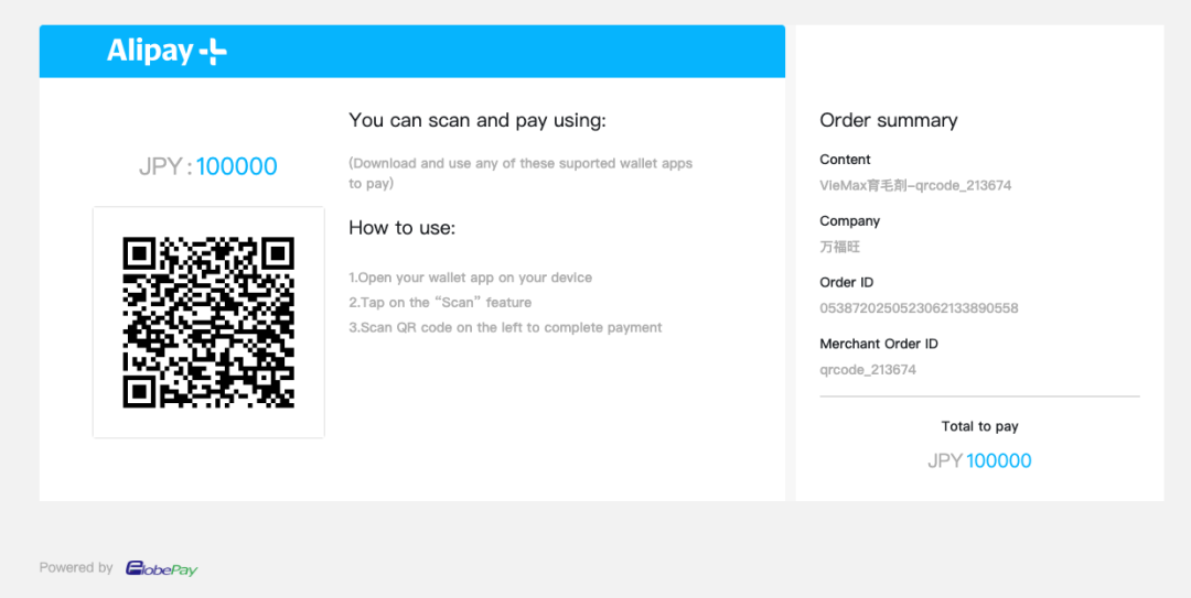 买家在PC端提交订单时选择支付宝支付,GlobePay显示支付宝付款码,买家使用支付宝扫码完成支付。