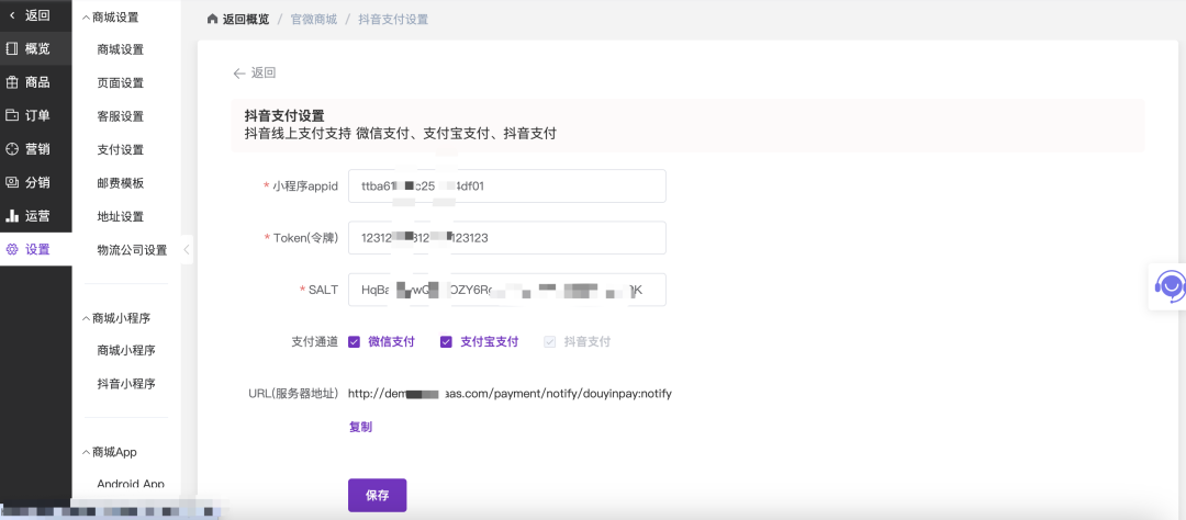 登录官微中心,进入商城模块,依次点击“设置”-“抖音支付设置”,点击“去配置”进入抖音支付配置页面。填写必填项小程序AppID、自行设置的Token(令牌)、从抖音支付后台获取的SALT值,配置支付通道(选择开启或关闭微信支付、支付宝支付),点击“保存”。