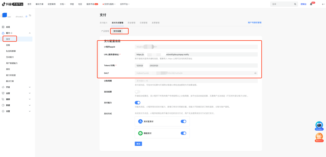 登录抖音小程序控制台,进入支付设置页面,将官微中心抖音配置页面中的URL链接复制粘贴到此处的URL处,同时在抖音后台的Token位置填入官微中心所填写的Token内容。