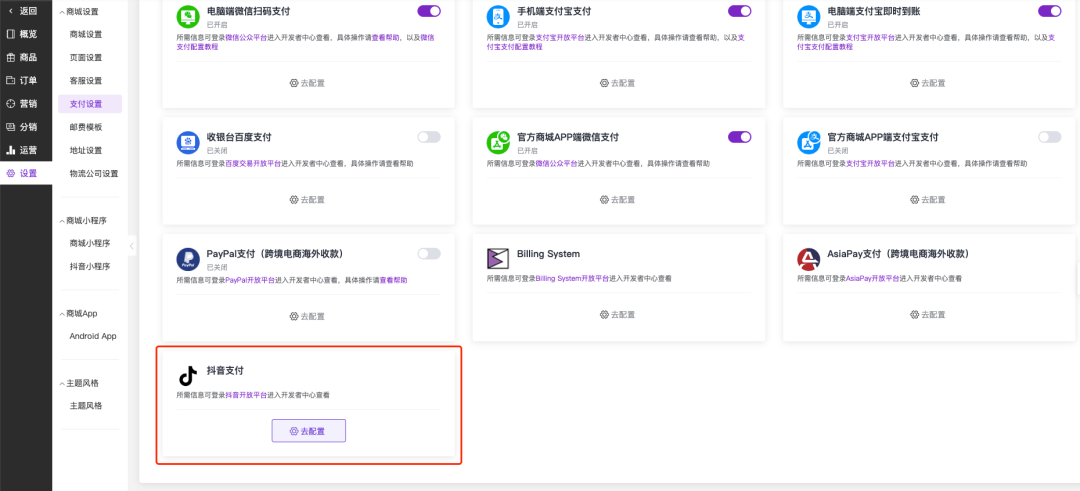 支持抖音支付、支付宝、微信支付多种支付通道,可根据业务需求灵活开启或关闭