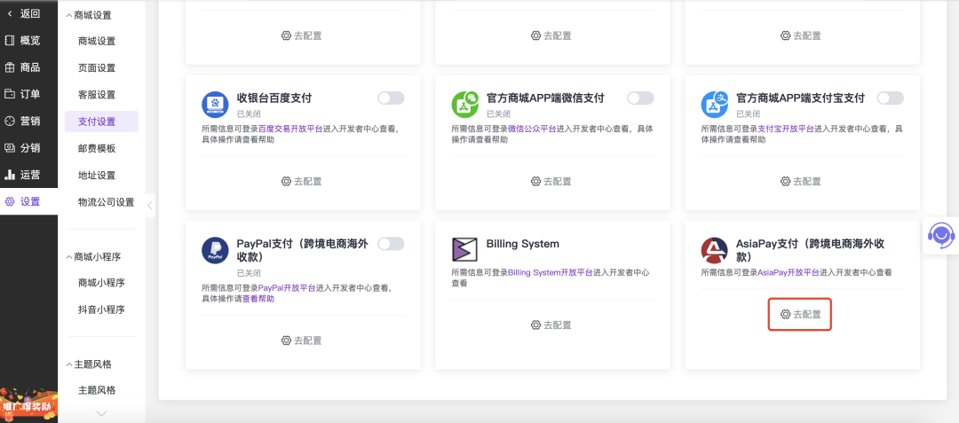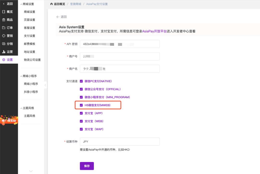 登录官微中心,进入商城模块,依次点击“设置”-“支付设置”-“AsiaPay支付”,点击“去配置”。填入API密钥、商户号、商户名,选择所需支付通道(如微信PC支付、微信公众号支付、H5微信支付、支付宝APP等),设置结算币种(如JPY),点击“保存”完成配置。
