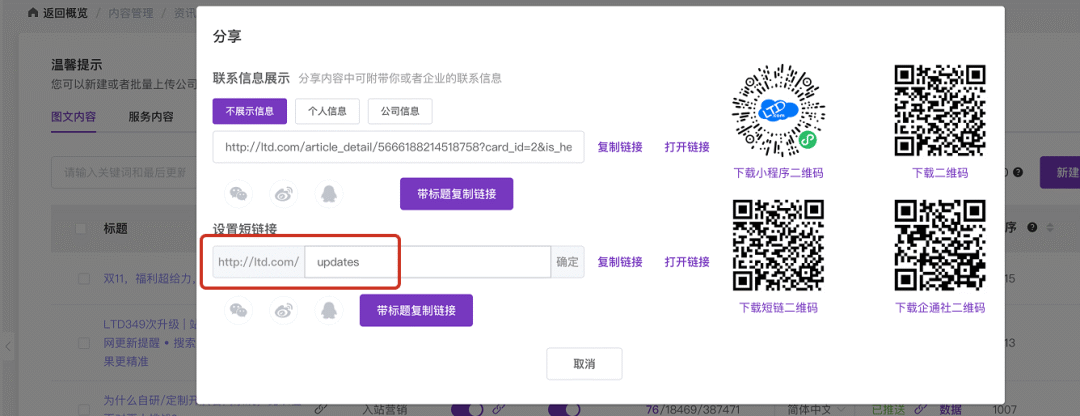 固定短链接便于长期推广,一键复制功能提升内容分发效率