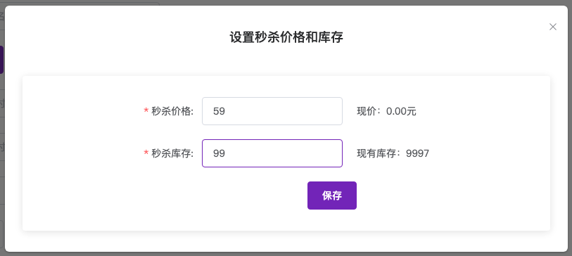 设置秒杀价格(如59元)、秒杀库存(如99件)