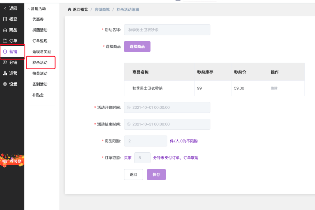 通过"官微中心 - 商城 - 营销 - 秒杀活动"进入秒杀管理界面