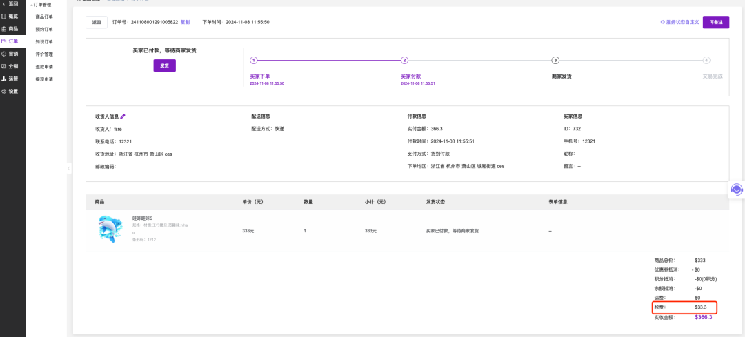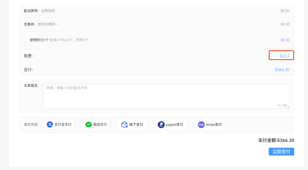 设置后,在前端商品详情页、下单页(PC/移动端)及订单详情页,将自动按比例计算并显示税费金额