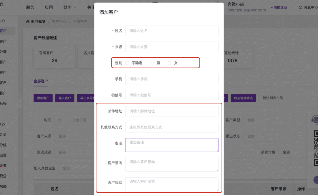 进入「客户管理 - 添加客户」,使用优化后的表单,填写包括性别、多联系方式、备注等更完整的客户信息。