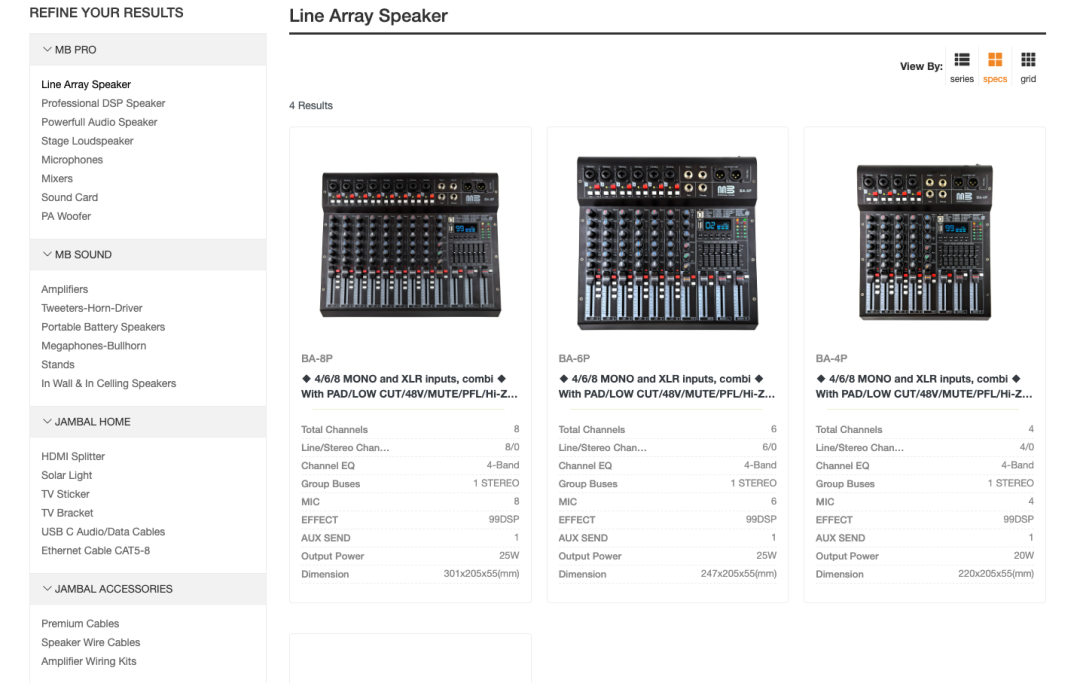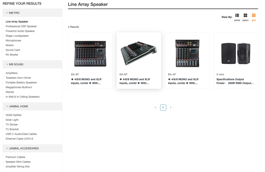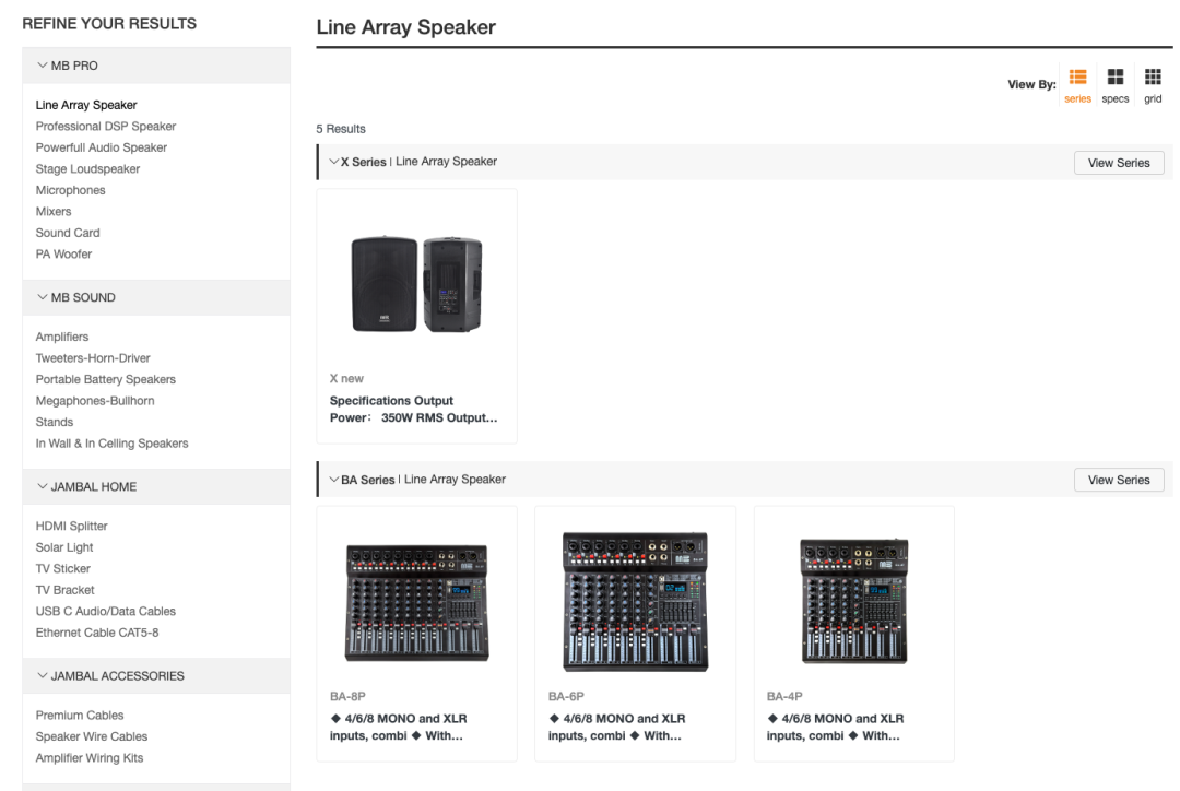 用户访问页面时,点击左侧不同分类筛选产品。在“按系列排列”模式下,可将鼠标悬停在产品图上查看多角度图片。
