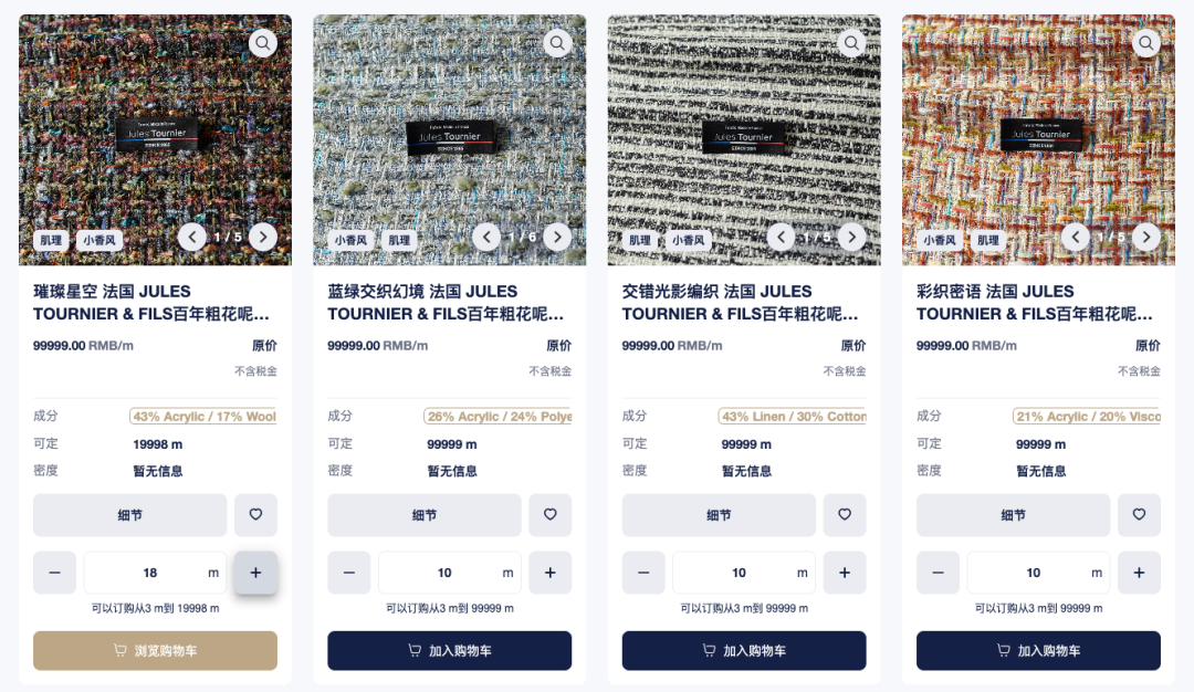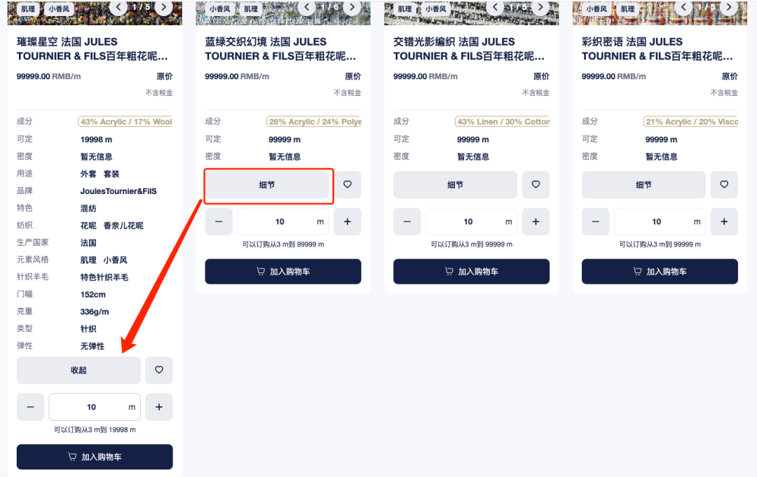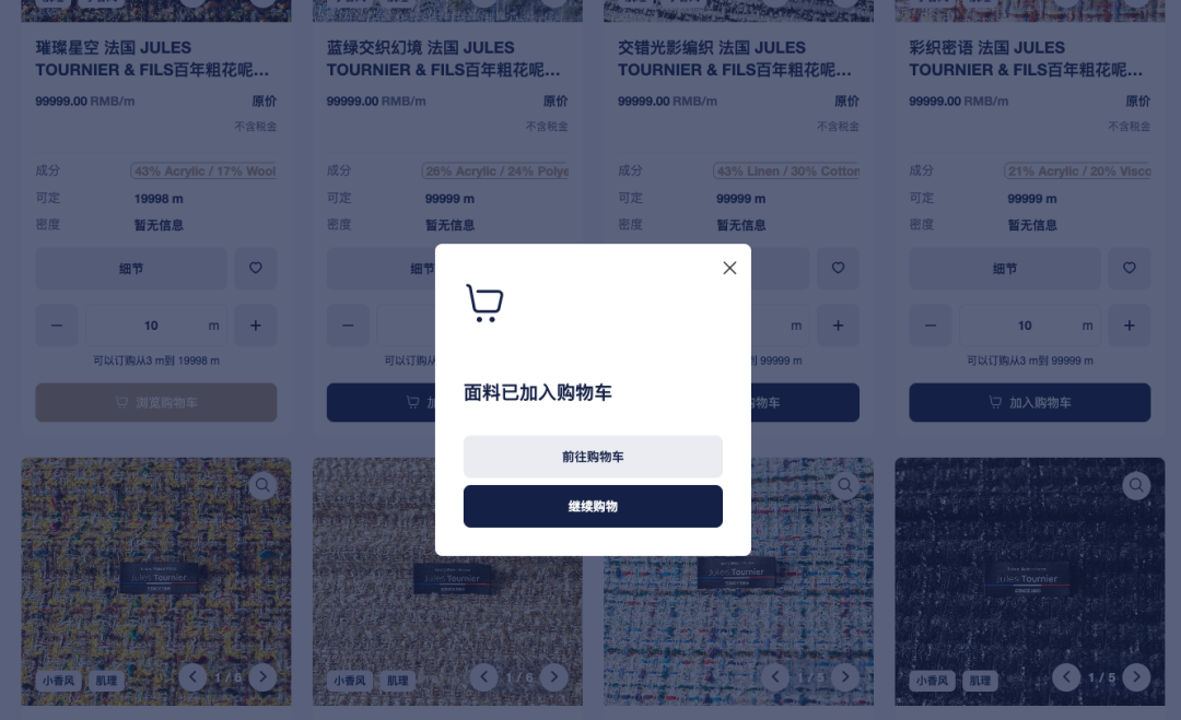 图示:点击“加入购物车”的交互反馈,以及可调整购买数量(如米数)的输入控件。