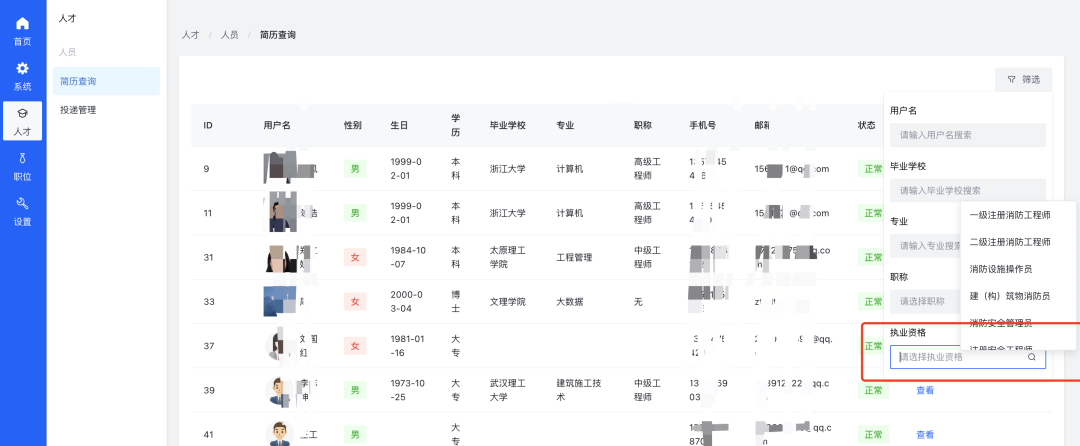 在简历查询功能中新增“执业资格”筛选条件,招聘方可根据岗位硬性要求,快速筛选出持有注册会计师、律师资格证、建造师等特定执业资格的人才,提升人岗匹配精准度。